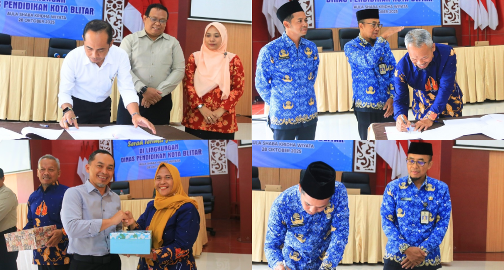 Dinas Pendidikan Kota Blitar menggelar Serah Terima Jabatan, dan Pelepasan Pegawai Purna Tugas sebagai wujud regenerasi dan penghargaan atas dedikasi. Kegiatan dilaksanakan di Aula Sabha Kridha Wiyata, Dinas Pendidikan Kota Blitar dan dihadiri oleh seluruh pegawai. Acara yang digelar pada 28 Oktober 2025 ini dimulai dengan sambutan dan dilanjutkan dengan prosesi penandatanganan berita acara serah terima jabatan. Terima kasih atas pengabdian, selamat mengemban amanah baru, dan teruslah menebar semangat untuk pendidikan yang berkarakter dan berdaya saing.